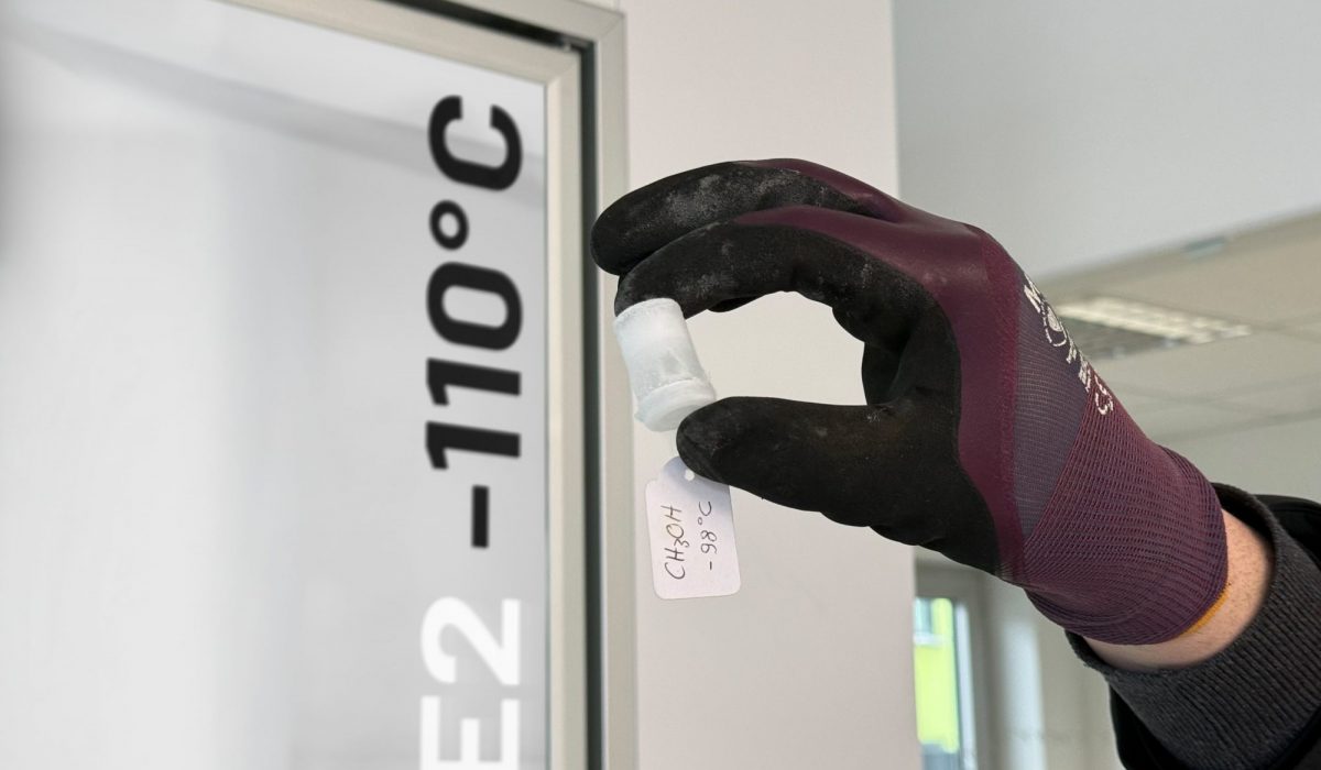 Methanol besitzt einen Gefrierpunkt von etwa –98 °C und ist regulär über Apotheken erhältlich. Für den Test wird eine kleine Menge in ein geeignetes, kältebeständiges und sicher verschließbares Gefäß gefüllt und in der bereits auf Zieltemperatur betriebenen Kältekammer positioniert.