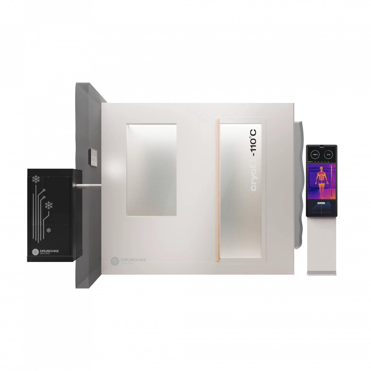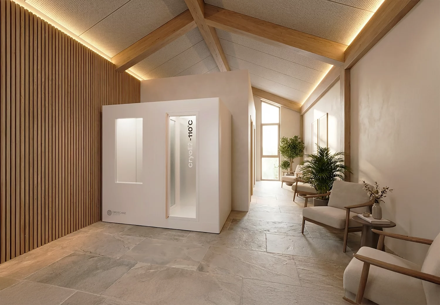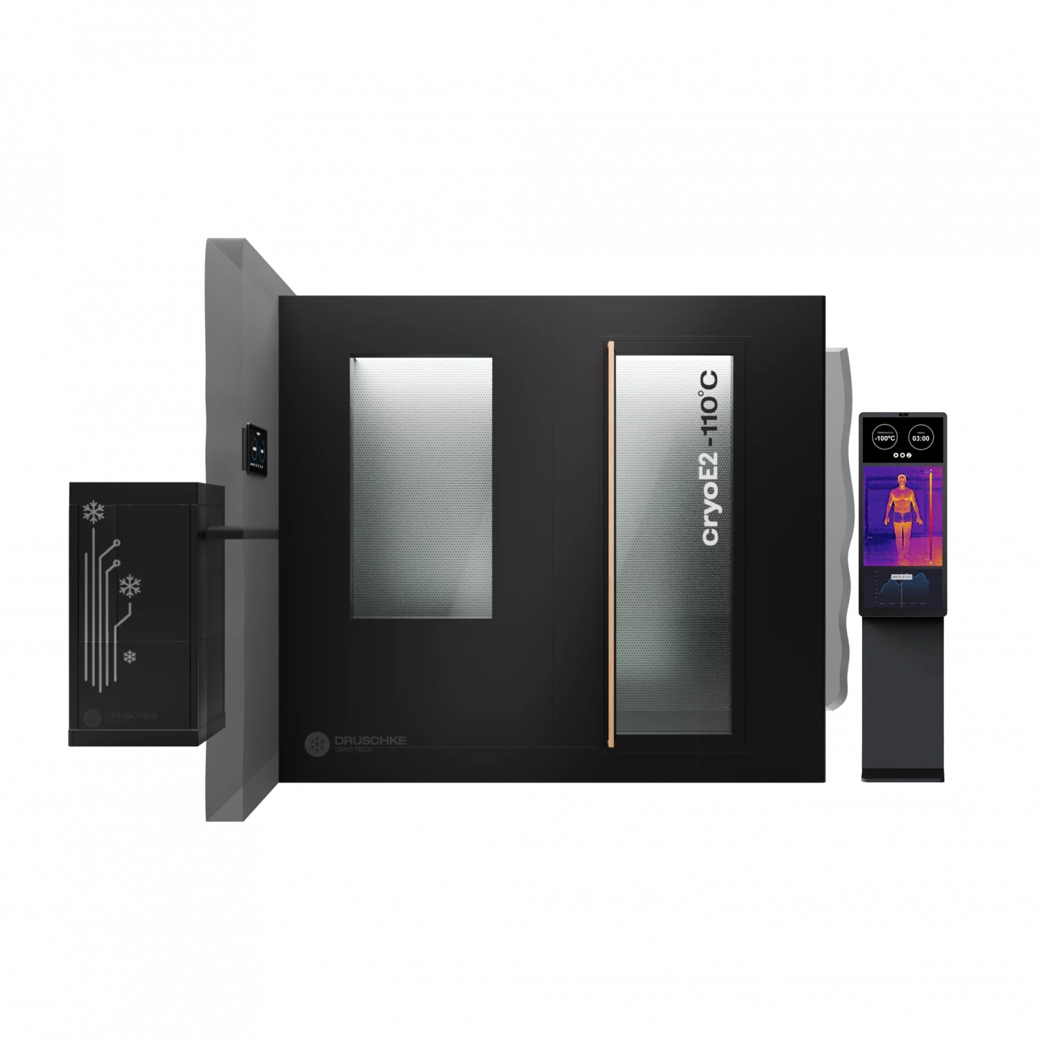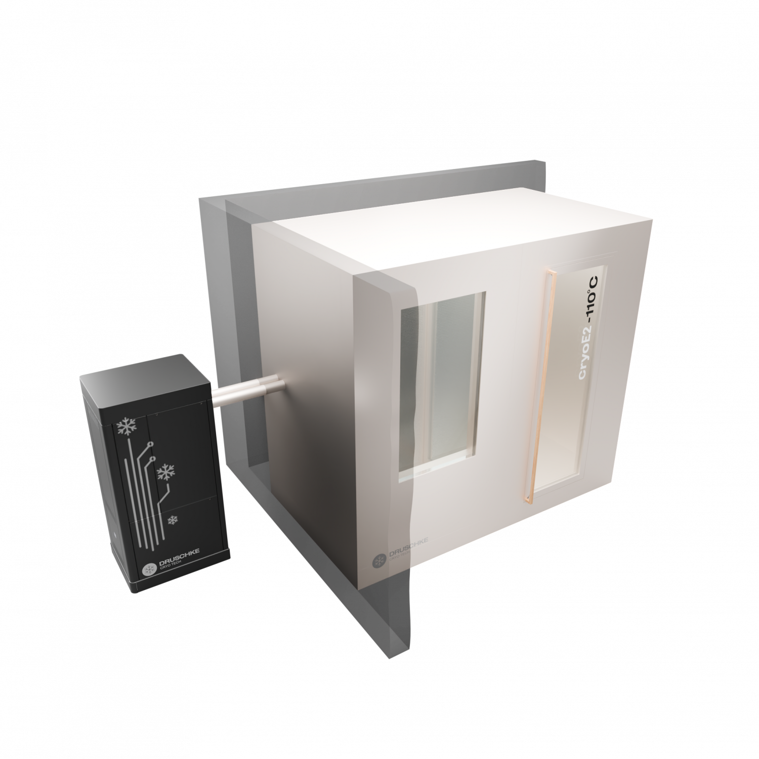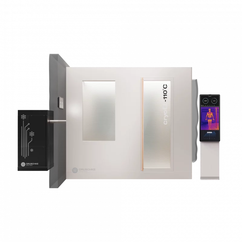 Die cryoE2 build-in ist eine innovative 2-Raum-Kältekammer, bei der der Cryo-Cooler unauffällig in der Nähe der Kammer installiert wird. Es wird keine Rückkühlung außerhalb des Gebäudes benötigt. Mit unserer Kühlleistung sind in der Vorkammer Temperaturen von -30°C und in der Hauptkammer von bis zu -110°C einstellbar.
